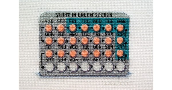 Katrina Majkut’s series, In Control, rejects the stereotypical domestic functionality of samplers. Her stitched still lifes focus on products related to women’s health, the body, and family planning. The commercial packaging pictured is often in contrast to their subjective, weighted political underpinnings.