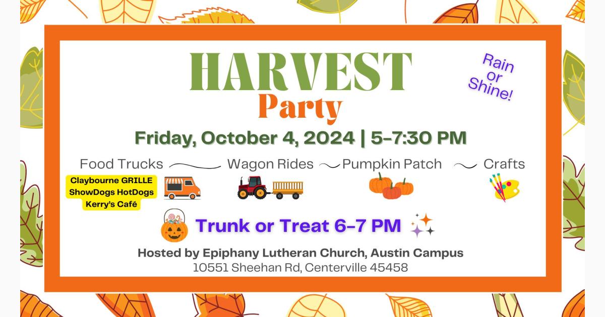 Epiphany's Harvest Party is a community-wide event open to one and all! Invite your friends to this festive fall event for the whole family! Kids, wear your costumes!