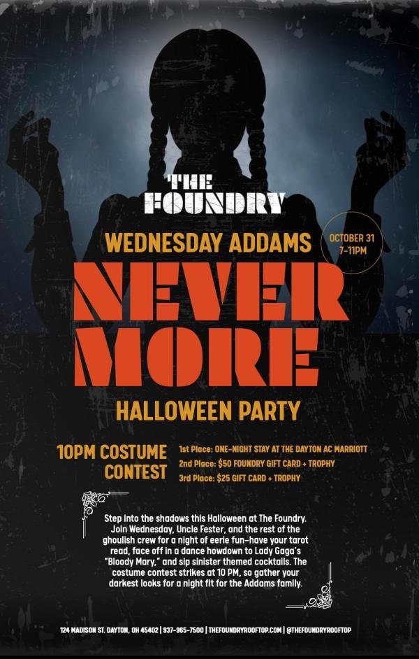 Looking to celebrate Halloween like a member of the Addams family? Come check out The Foundry's Wednesday Addams Never More Halloween Party from 7-11 pm on October 31st. Located within the AC Hotel Dayton.