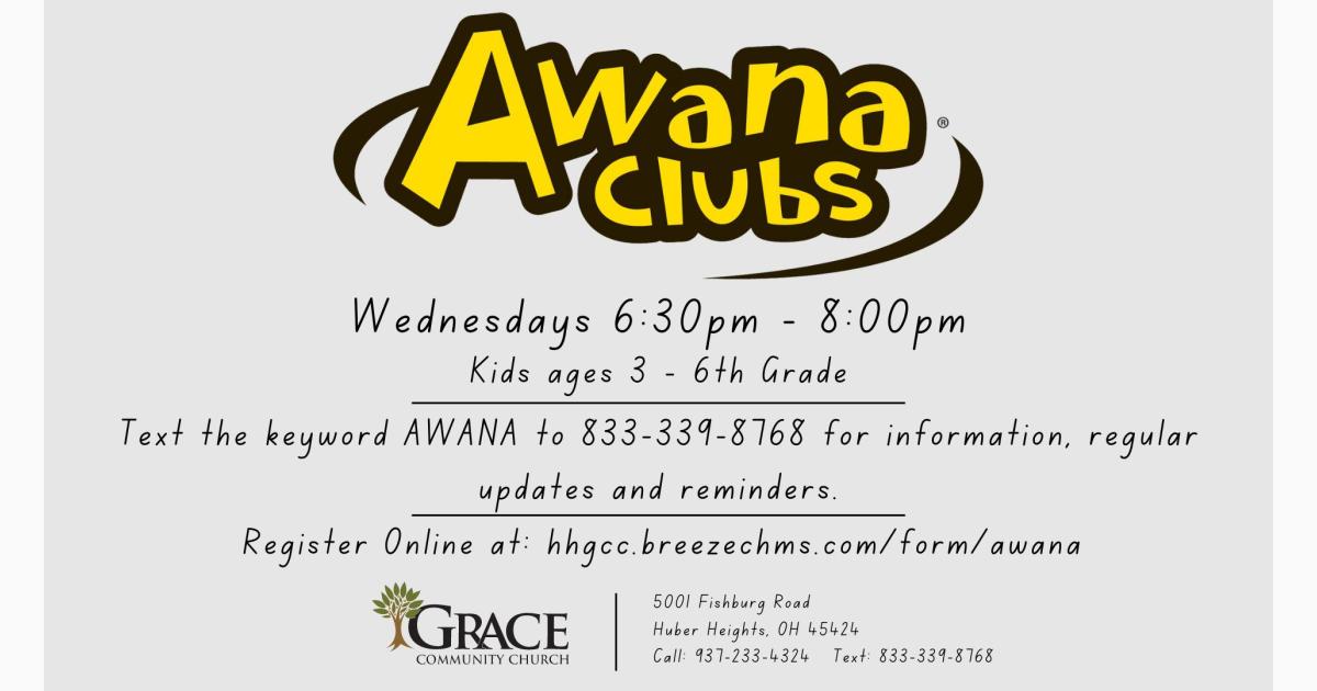 AWANA is taking place at Grace Community Church, which is located at 5001 Fishburg Road in Huber Heights. Grace Community Church - Grace Community Church is a Grace Brethren church in Huber Heights, Ohio, near Dayton. We are community of believers focused on exalting God and encouraging people.