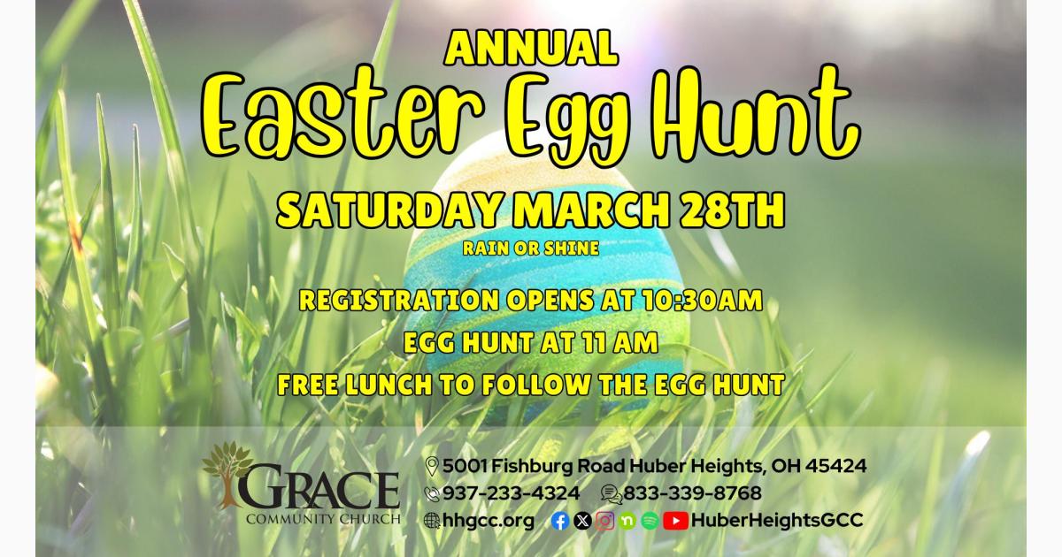 Easter Egg Hunt at Grace Community Church is taking place at Grace Community Church, which is located at 5001 Fishburg Road in Huber Heights. Grace Community Church - Grace Community Church is a Grace Brethren church in Huber Heights, Ohio, near Dayton. We are community of believers focused on exalting God and encouraging people.