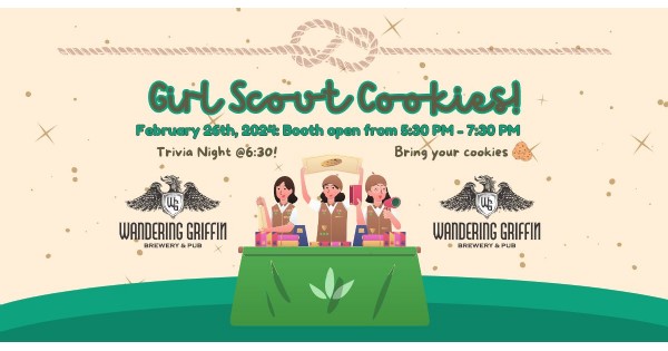 Join us at the Wandering Griffin Brewpub for a delightful evening! On February 26th, from 5:30 pm to 7:30 pm, we're hosting a Girl Scout Cookie booth pop-up.