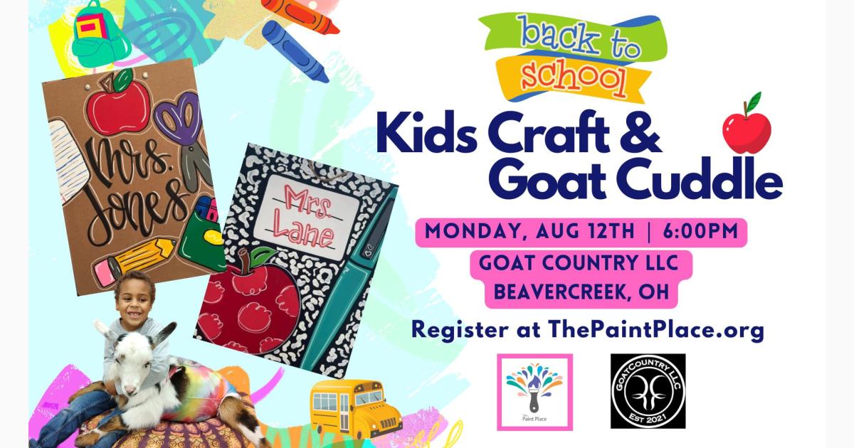 Join The Paint Place Monday, Aug 12th, for a fun evening of art and goat cuddle at Goat Country LLC at The Greene Shopping Mall! Jacki will lead your kiddo/s step-by-step to create a their Back to School Craft.