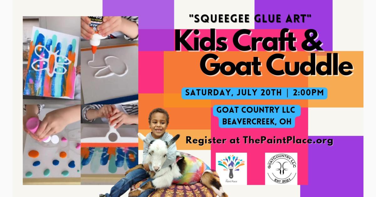 Join The Paint Place Saturday, July 20th, for a fun evening of art and goat cuddle at Goat Country LLC at The Greene Shopping Mall! Jacki will lead your kiddo/s step-by-step to create a their Squeegee Glue Art. Your kiddo is welcome to personalize it with various colors and patterns. Parents are encouraged to help too :)
