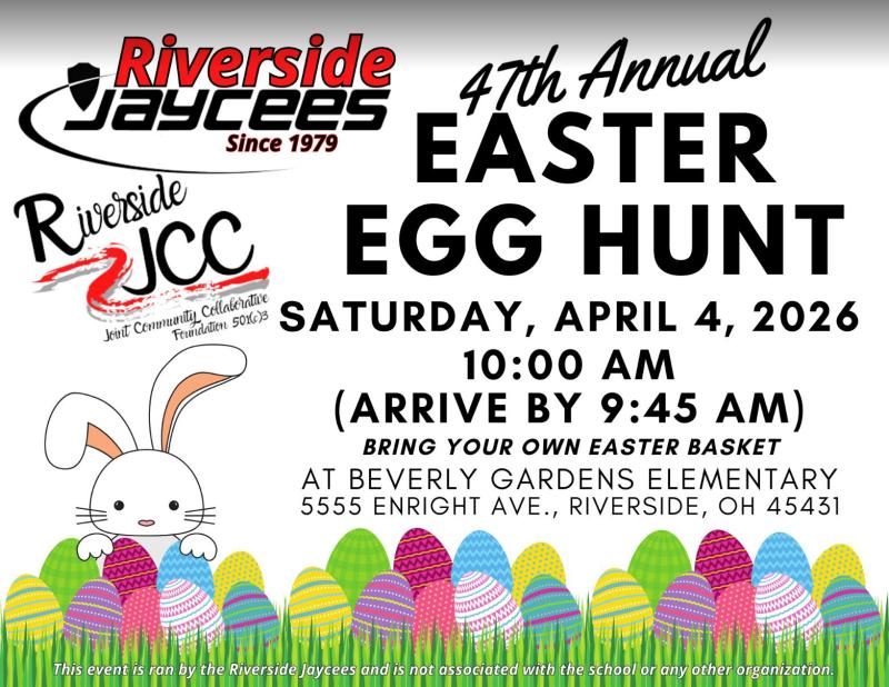 47th annual Riverside Jaycees Easter Egg Hunt Saturday, April 4 - 10am, arrive by 9.45. Bring your own Easter Basket!