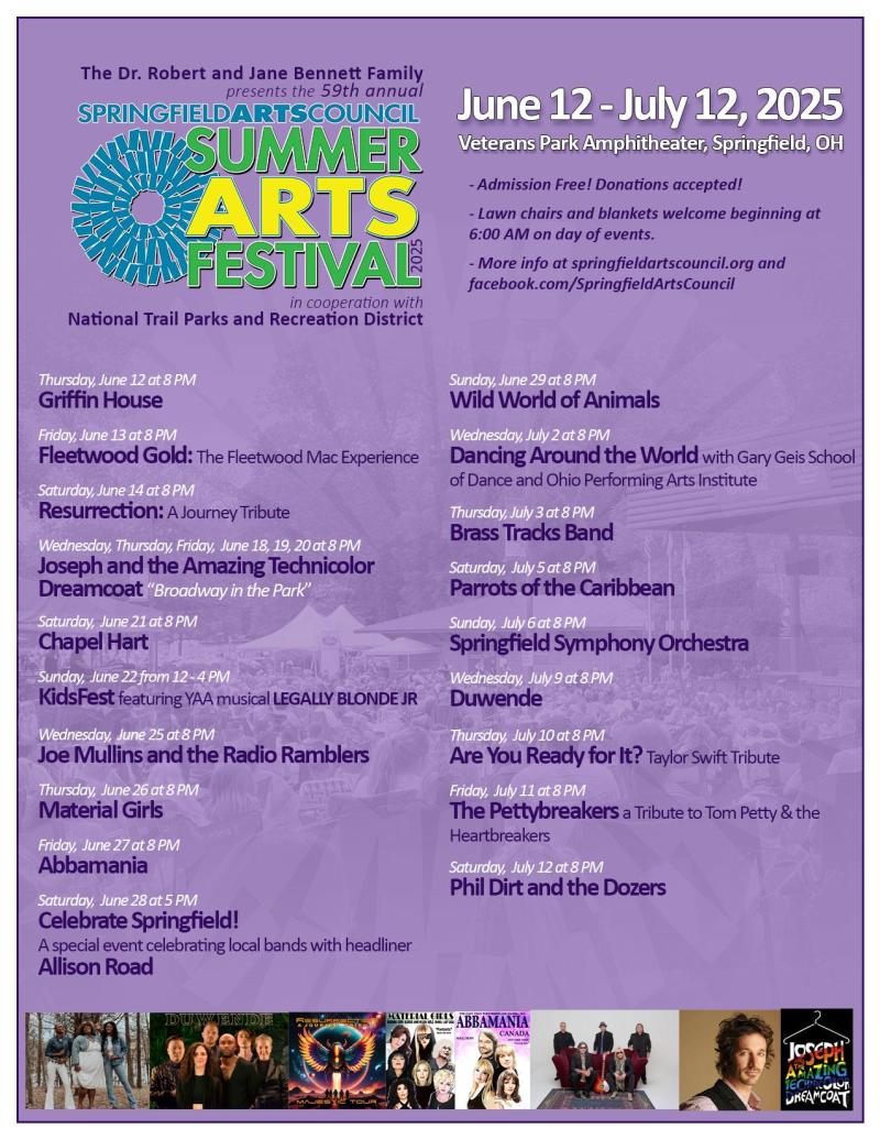 The Springfield Arts Council’s Summer Arts Festival returns to downtown Springfield with over twenty evenings of admission-free entertainment under the stars! Be sure mark your calendar now and get your lawn chairs ready for the 58th season of Springfield’s favorite summer tradition, The Summer Arts Festival!