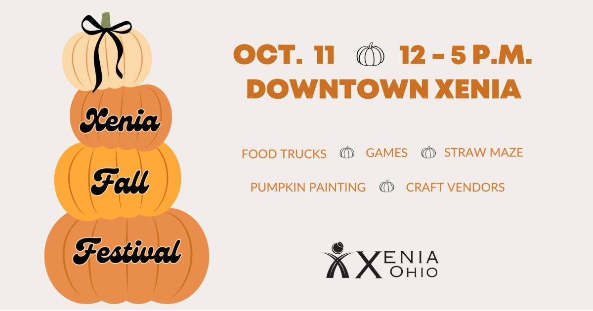 Mark your calendars! Join us for the Xenia Fall Festival on Oct. 11 from 12-5 p.m. in Downtown Xenia. Enjoy food trucks, games, a straw maze, pumpkin painting, craft vendors, and much more.