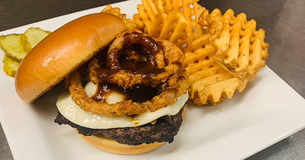 All of our burgers are ½ pound and made fresh to order and served with homemade potato chips. Substitute waffle or shoestring fries for $1.00. Onion Rings, onion straws or sweet potato fries for $1.75