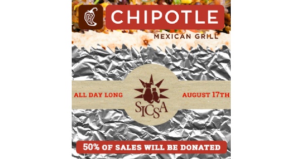 Make lunch and dinner a selfless act by joining us for a fundraisier to support SICSA Pet Adoption Center. Come in to any Greater Dayton Chipotle location on Thursday, August 17th between 10:45am and 10:00 pm. Bring a flyer, show this page on your smartphone, or simply tell the cashier you're supporting the cause to make sure that 50% of the proceeds will be donated to SICSA Pet Adoption Center.