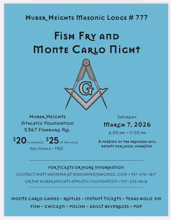 The Huber Heights Masonic Lodge will host its 1st Annual Fish Fry and Monte Carlo Night on Saturday, March 7, 2026. The Fish Fry will be from 6:00 PM to 11:00 PM at the Huber Heights Athletic Foundation at 5367 Fishburg Road. Monte Carlo games, raffles, instant tickets, texas hold 'em, fish, chicken, polish, adult beverages, pop. Tickets are $20 in advance or $25 at the door.