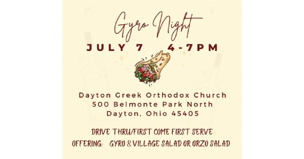 From the organizers of Dayton Greek Fest, Gyro Night Drive-Thru at the Dayton Greek Orthodox Church - First come, first served
