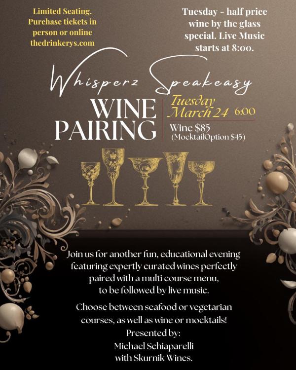 March Wine & Dinner Pairing with Michael Schiaparelli, CSW is taking place at Whisperz Speakeasy, which is located at 926 Watertower Lane in West Carrollton. Whisperz Speakeasy - A prohibition-era style lounge in an elegantly refined setting serving handcrafted cocktails, mocktails, specialty teas, coffees, and uniquely designed small plates. Featuring FREE live music 5 nights per week, Tues-Sat.