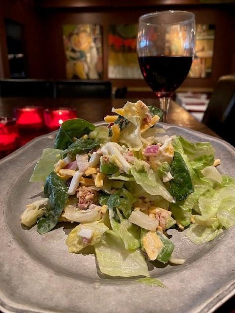 Peasant Salad – lettuce, spinach, bacon, egg, onion, cheddar, peas, peppers, and peasant dressing, or