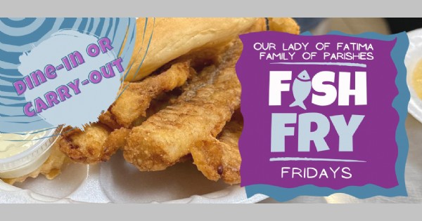 St. Mary Church Friday Fish Fry carryout & dine-in with Fried or Baked Fish, Macaroni & Cheese or Fries, Cole Slaw or Applesauce, Dinner Roll.