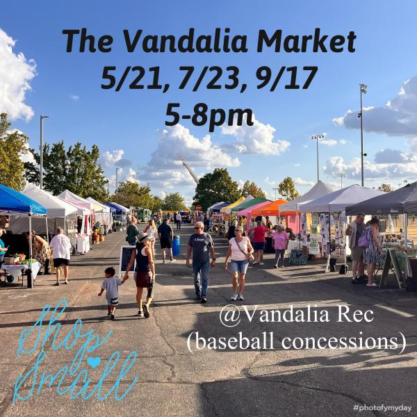 Located near the baseball concessions at the Vandalia Rec Center, shop local vendors, enjoy delicious food trucks and listen to local musicians