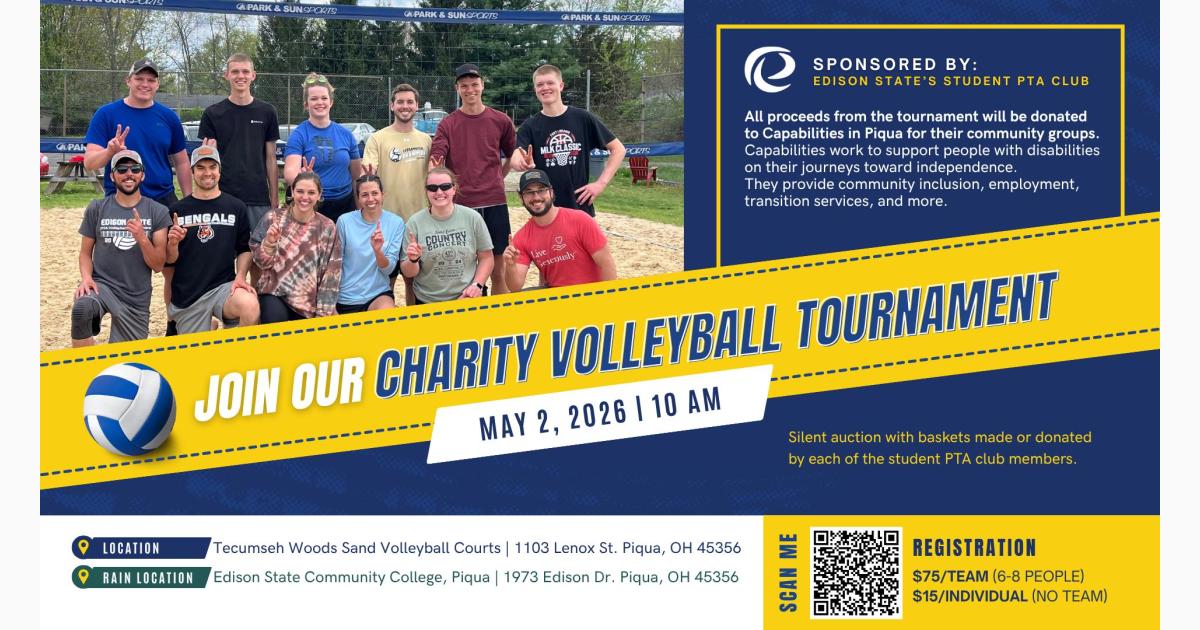 Get ready to serve up some fun for a great cause! 🏐 The Edison State Student Physical Therapy Assistant (PTA) Club is hosting a Charity Volleyball Tournament on Saturday, May 2. All proceeds will be donated to Capabilities Community Club in Piqua.