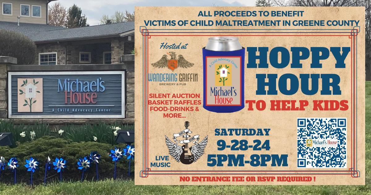 RSVP Here: Join the "Hoppy Hour to Help Kids" event at Wandering Griffin Brewery & Restaurant on September 28th, 2024, from 5 PM to 8 PM! This event is not just a great time, but also an opportunity to support victims of child maltreatment in Greene County.