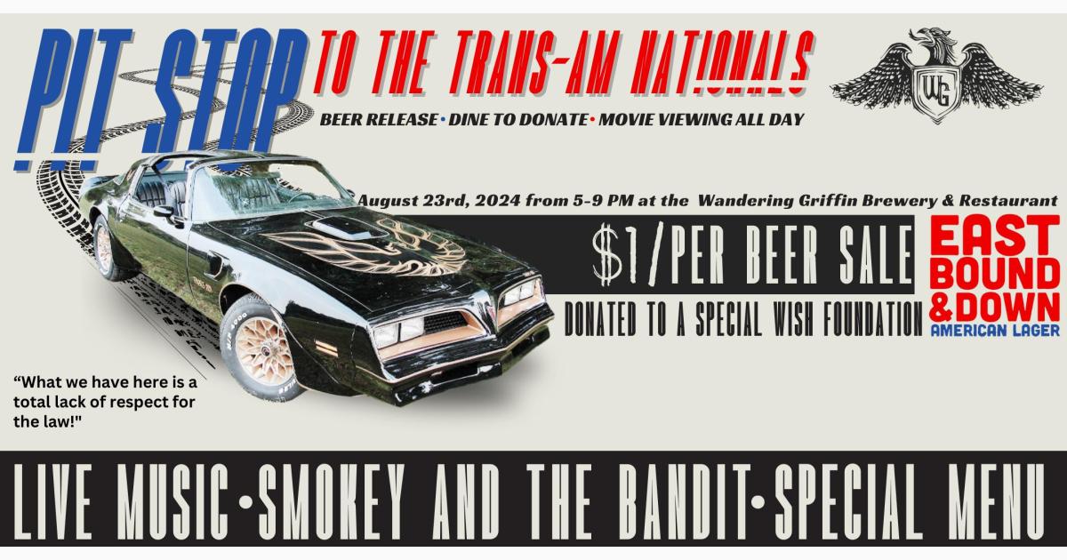 Buckle up, gearheads! It's time to hit the brakes and park yourself at the Wandering Griffin and make a Pit-Stop to the Trans-AM Nationals on August 23rd, 2024, from 5 to 9 PM! This ain't your grandpa's car show – it's a high-octane blend of roaring engines, toe-tapping tunes, and lip-smacking grub, all for a fantastic cause.