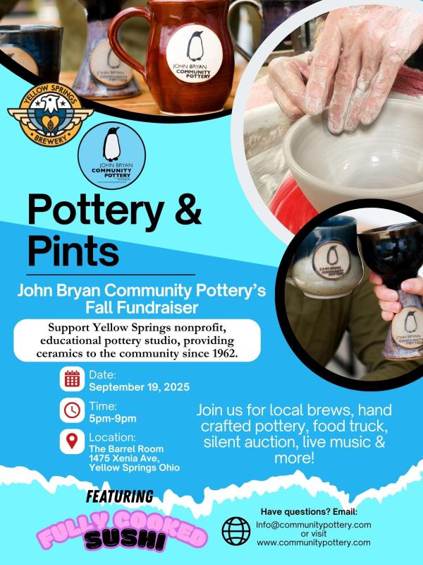 Join the community in supporting nonprofit pottery education in the miami valley. John Bryan Community Pottery has been offering community enrichment through low cost pottery education in Yellow Springs Ohio since 1962 and our annual fundraiser helps us continue this mission.