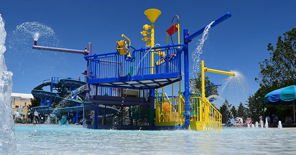 Our waterpark includes two giant water slides, drop slide, diving board, heated baby pool, interactive water play equipment in zero depth area, zero depth entrance, and more!
