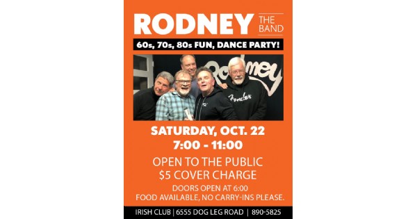 Rodney The Band - Saturday, Oct. 22 7:00 - 11:00 - Open to the Public. $5.00 cover charge. Doors open at 6:00. Food available. No Carry-Ins please.