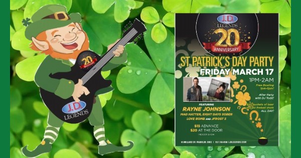 St. Patrick's Day Party with Rayne Johnson is taking place at JD Legends Entertainment Complex, which is located at 65 Millard Dr in Franklin. JD Legends Entertainment Complex - JD Legends entertainment complex is an indoor/outdoor complex featuring a 24 lane bowling center, 3 sand volleyball courts, a tiki bar , sports bar , restaurant , night club and concert venue.
