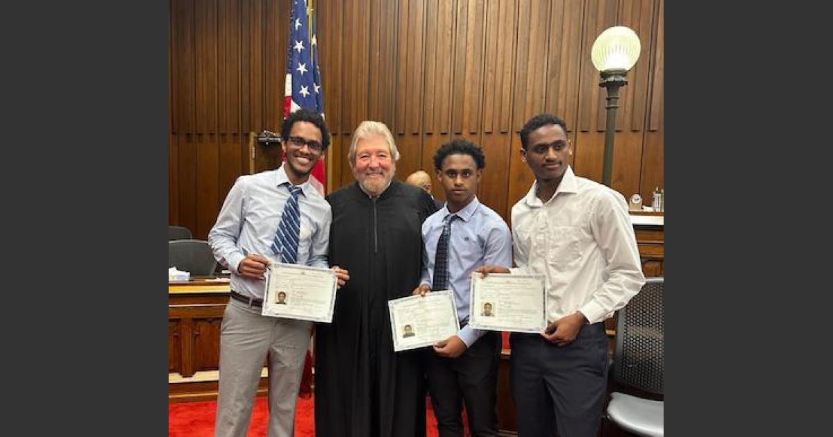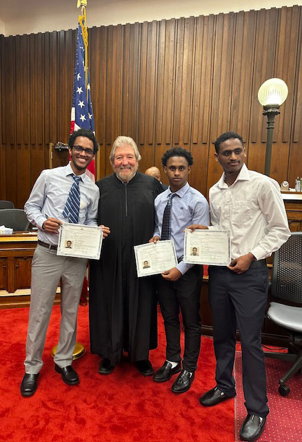 Photo above: Tesfalem Mehari (left) and his brothers pose for a photo with Judge Rose following the naturalization ceremony.