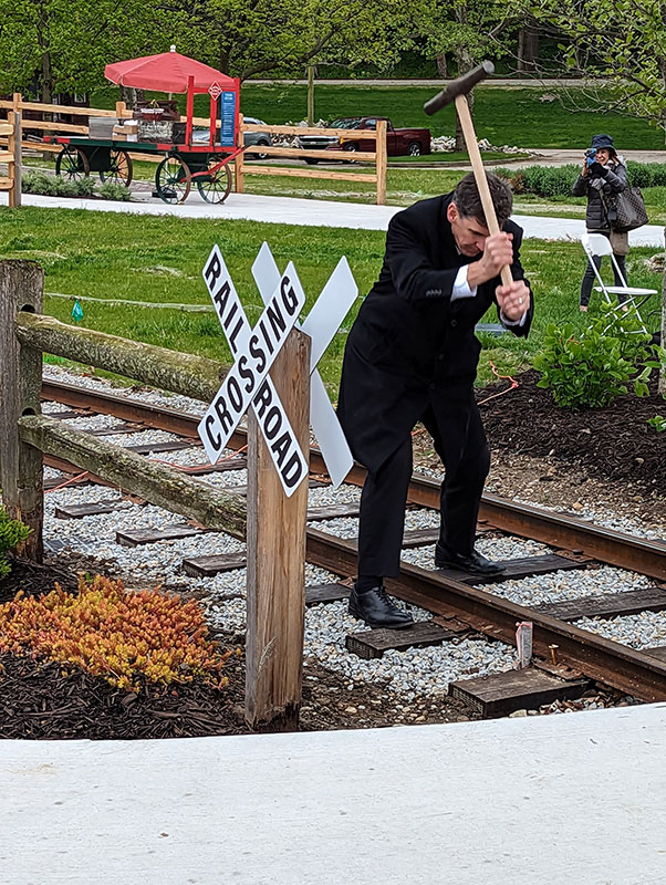 Brady Kress, President & CEO at Dayton History drives the last "Golden" spike during the ceremony. Note, the spike is not actually made of gold!