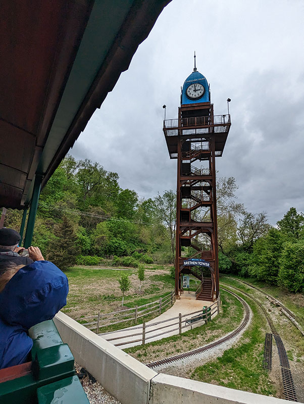 The train passes the Brethen Tower, the 100-foot-tower topped by the historic Callahan clock.