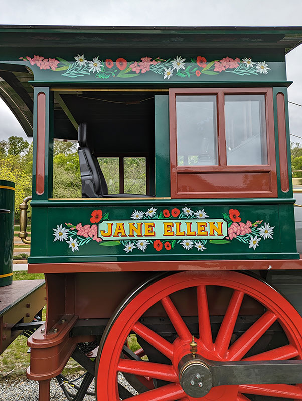 The locomotive, named "Jane Ellen" has flowers around the name, including poppies, which represent Edith Deed's love of Belgium. Fun fact: Did you know that the Belfry of Bruges (a medieval bell tower in the town square of the Belgium capital) was the inspiration for the Deeds Carillon? Edith Deeds fell in love with the sound of carillon bells during a visit to Bruges during the 1930s and the rest, as they say, is "Dayton History".
