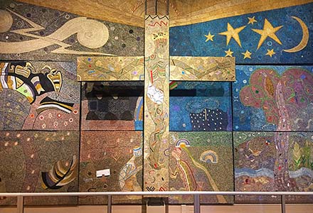 After viewing the exhibit on the museum’s lower level, visitors will want to go upstairs to the Renaissance Gallery (Gallery 220) to view the collection’s largest and most breathtaking work, The African Crucifixion. The work is 15 feet high and was created by seven Ubuhle artists, each dedicating one year to completion of the work. Originally commissioned for an Anglican cathedral, the work has become part of the traveling exhibit and defies description in its radiance when bathed in the natural light of the gallery.