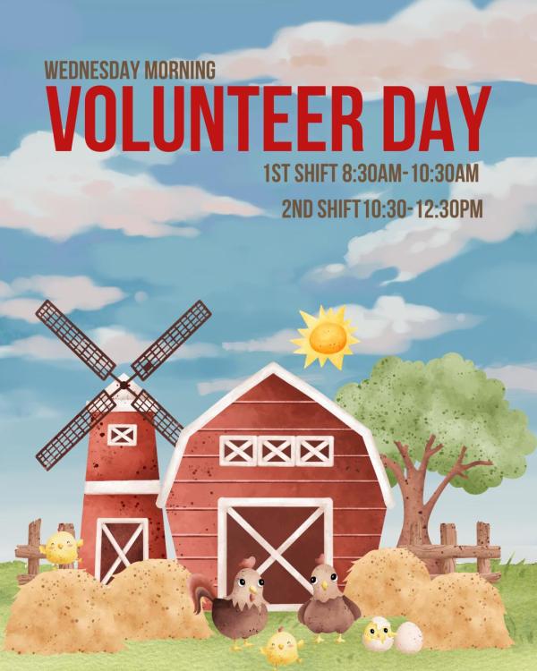 Join us every every Wednesday morning to help around the farm! We need helpings for animal care, garden work, cleaning and much more!