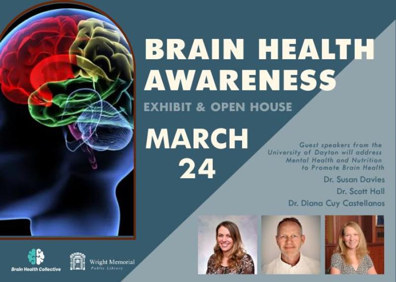Wright Memorial Public Library and the Brain Health Collective are hosting an Open House of the exhibit "Brain Health Awareness" with three guest speakers from the University of Dayton on Tuesday, March 24th at 3 pm in the Wright Library Community Room. Drs. Susan Davies and Scott Hall will speak on the mental health component of comprehensive brain health and Dr. Diana Cuy Castellanos will address nutrition and dietetics. Coffee and cookies will be served.