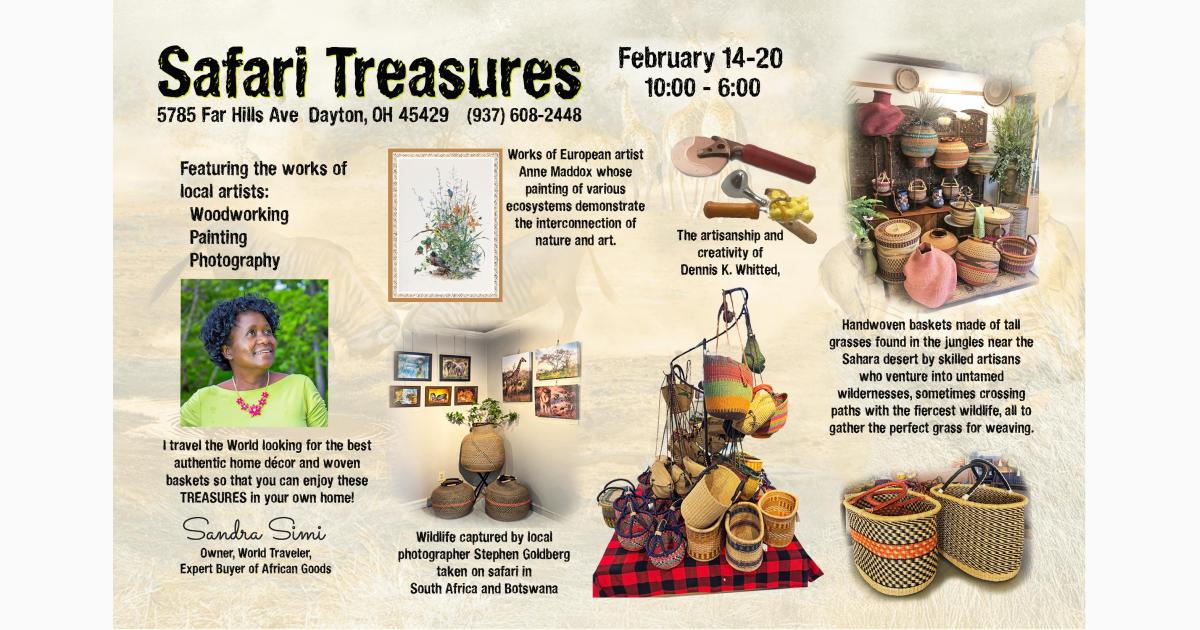 Unique artwork by talented local artists at Safari Treasures is taking place at Safari Treasures, which is located at 5785 Far Hills Ave in Dayton. Safari Treasures - Explore our exquisite collection of one-of-a-kind woven baskets and custom handbags designed to elevate your home décor