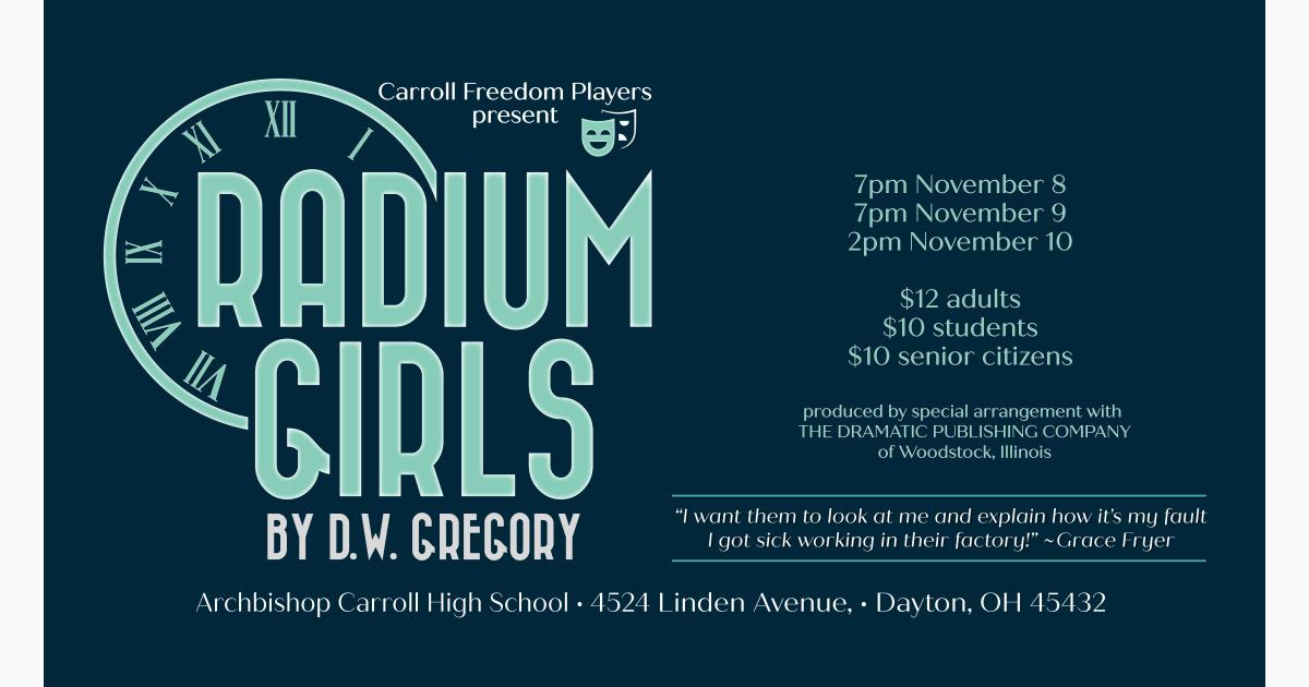 Carroll’s Freedom Players will perform the inspiring production of Radium Girls on November 8th at 7pm, 9th at 7pm, and 10th at 2pm. Presented by arrangement with Dramatists Play Service Inc. and written by D.W. Gregory, Radium Girls offers a wry, unflinching look at the peculiarly American obsessions with health, wealth, and the commercialization of science.