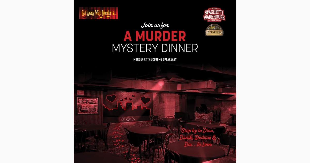 Enjoy a delicious Spaghetti Warehouse Mystery Theater dinner! We're serving a crisp green salad, fresh warm bread, choice of special select entrees, dessert, soft drinks, and a live interactive comedy mystery show!!