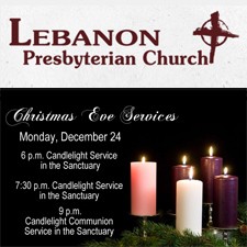 Looking for a quiet place to celebrate the joy? Please join us for one of our candlelight services at 6 PM, 7:30 or 9.Lebanon Presbyterian Church