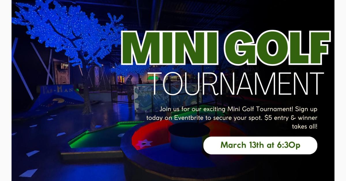 Join us on March 13th at 6:30 PM for an evening of friendly competition and mini golf excitement! Navigate tricky holes, conquer obstacles, and putt your way to victory for the title of Mini Golf Champion. Entry is just $5—winner takes all! Gather your crew and aim for that hole-in-one. Don’t miss it!
