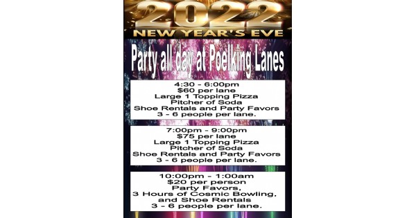 Start the New Year's Eve festivities early with family and friends. Our second party of the day starts at 6:00pm. This Rock and Bowl party is just $75 per lane. That $75 gets you 1 lane for 2 hours of bowling, a large 1 topping pizza, pitcher of soda, shoe rentals, and party favors for up to 6 people. Only paid reservations will guarantee you a lane so call today. 937-299-5573.