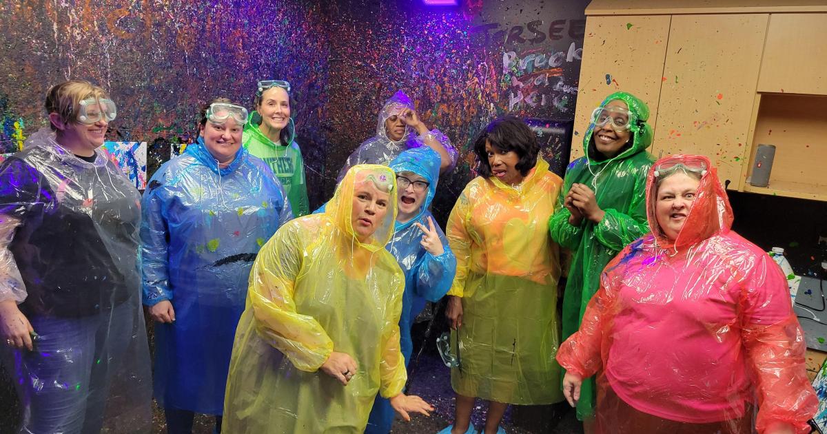 Plan for this being a 1 hour activity of expressive fun. Includes instructions, canvas prep, suiting up, splatter painting, and clean up for kids and adults! Includes private Splatter Room™ and protective gear. Dress up, fling paint at a canvas, and take home a messy masterpiece! $29 Per Person includes one 9×12 canvas panel, protective gear including a poncho, goggles & shoe coverings.