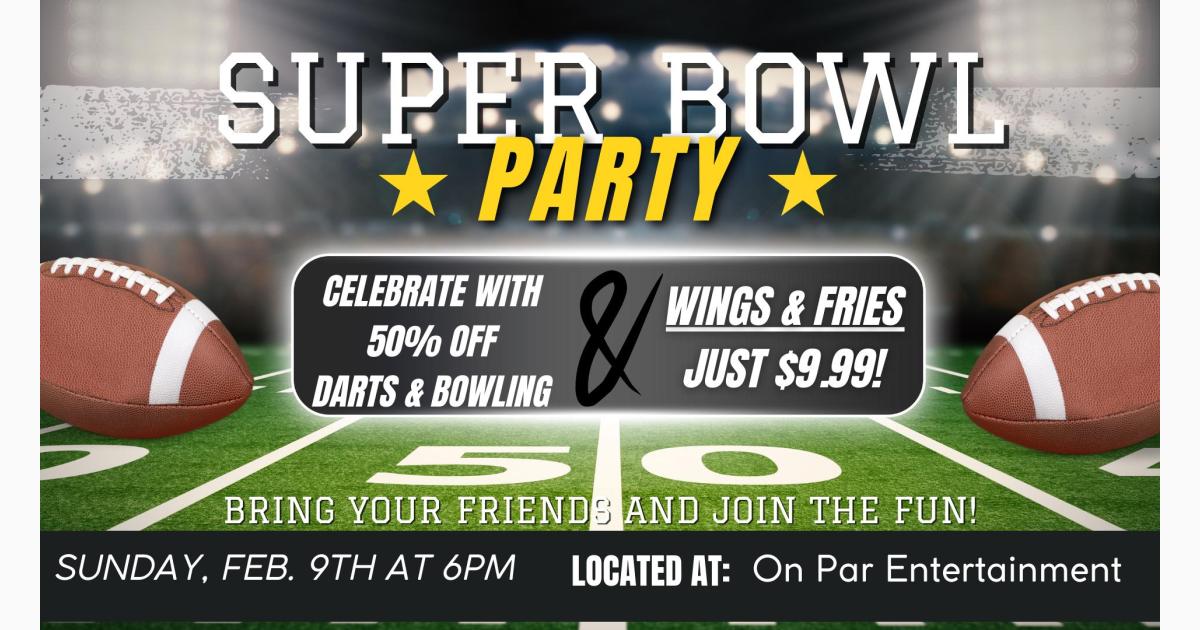 Super Bowl Party at On Par Entertainment! Feb 9, 6 PM. 50% off Darts & Bowling + Wings & Fries for $9.99. Bring your friends!