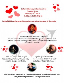 A special Valentines Day comedy show. This show is one you want to see. Special decorations, candles on all the tables, each ticket also gets a complimentary glass of Champaign. Along with special drink prices. Your headliner for the evening Headliner Saleem Ibn James Muhammad. His credits include appearances on “The Tonight Show with Jay Leno”, NBC’s “Last Comic Standing”, TBS’s “Lopez Tonight” FOX’s “Best Damn Sport Show…Period” Your feature act Travis Clyburn Travis has also been at Wiley’s Comedy Club, the Funny Bone and performed in Los Angeles California. Host and emcee Tracy Cooper. Tracy has been seen at Wiley's Comedy Club, The Funny Bone, took honors at the San Antonio Texas All Star Comedy jam and coming off his tour in Georgia and Florida. Special guest Karen Jaffe Seen at Wiley’s Comedy Club, and all over Ohio and Indiana. Tickets are 10.00 in advance. Safari Hideaway is located at 2037 Centerplex Lane Kettering Ohio 45420 LOCATED in the back section of the shopping complex on Dorothy and Woodman in Kettering that includes Elder Beerman, Subway, Sally's beauty Supply. Directly behind Chase Bank. Across from Woodman Lanes.